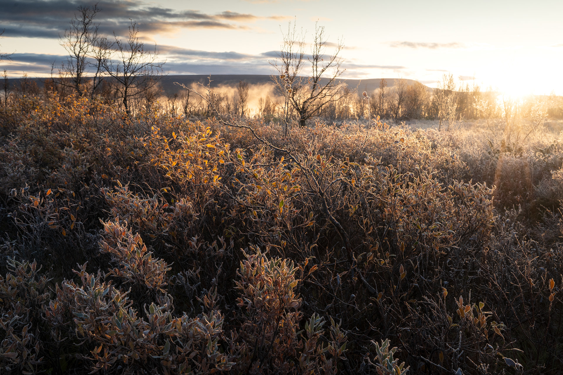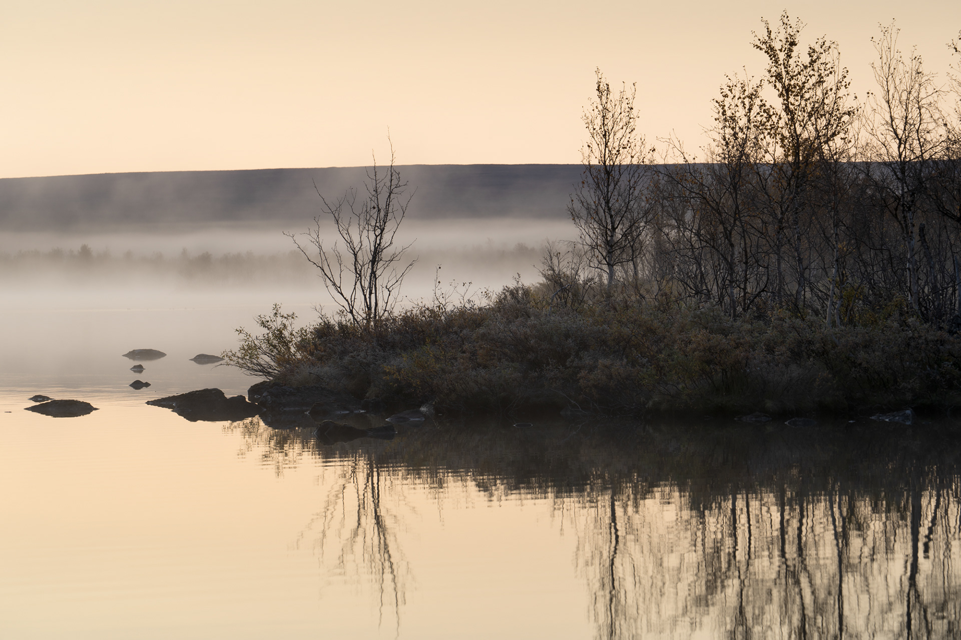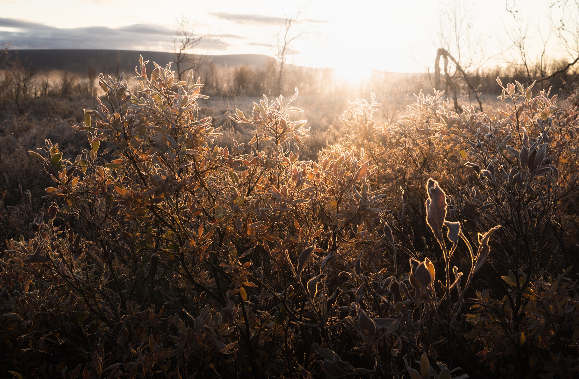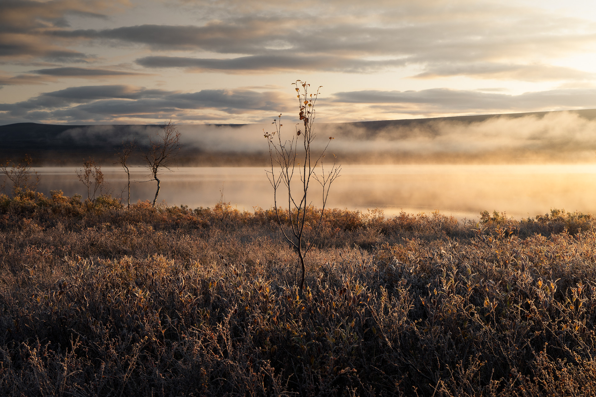This morning was a highlight during the Kvikkjokk-Saltoluokta stage of the Swedish Kungsleden: a quiet, misty sunrise on the shores of the mirror-like Lake Sitojaure. Soft hoarfrost covered the land, and it was not until the sun had risen high enough to melt the ice and burn the mist away, did we return to the autumnal colours of the vast arctic landscape around us.