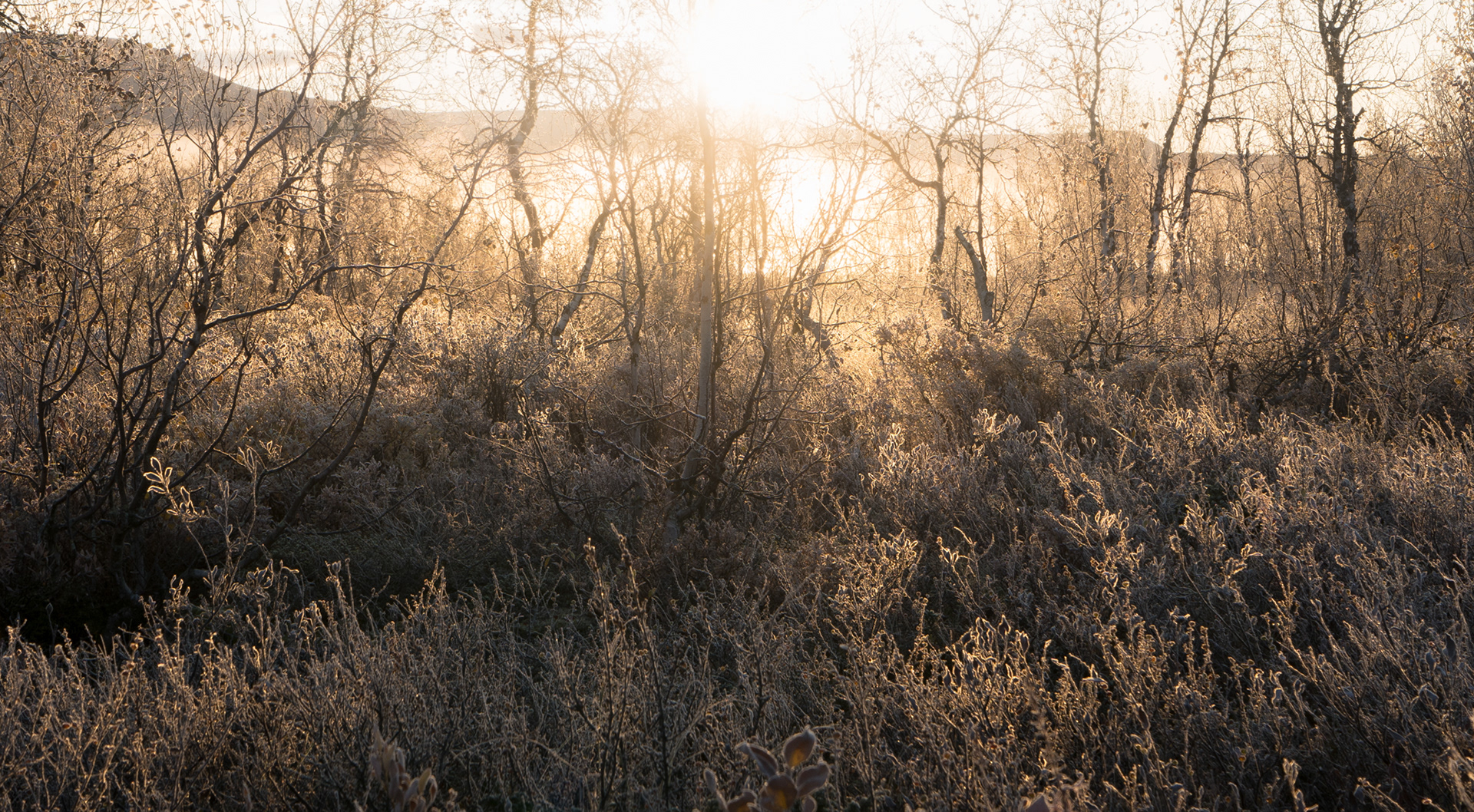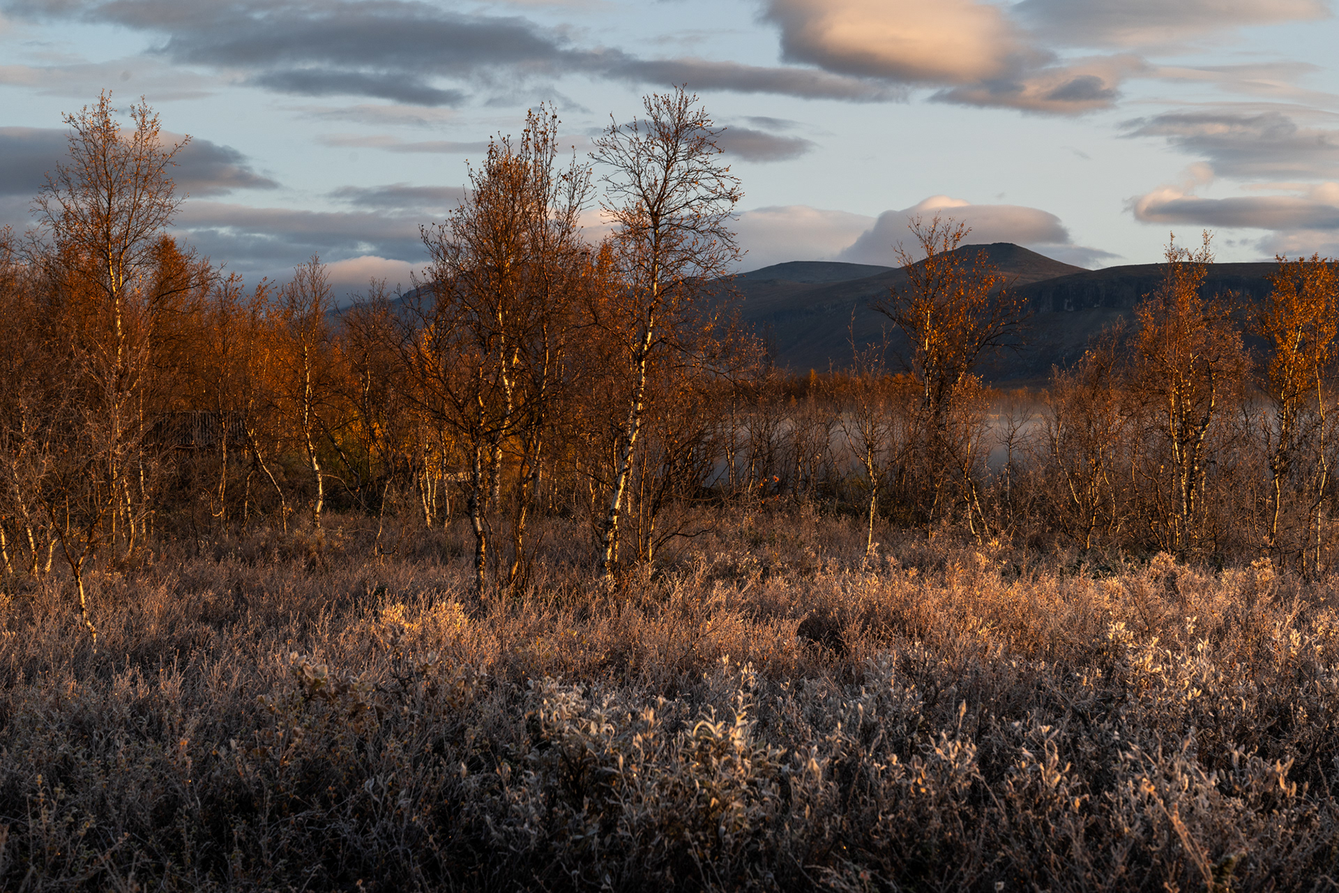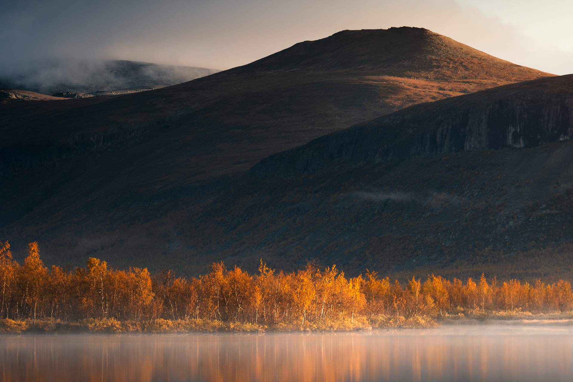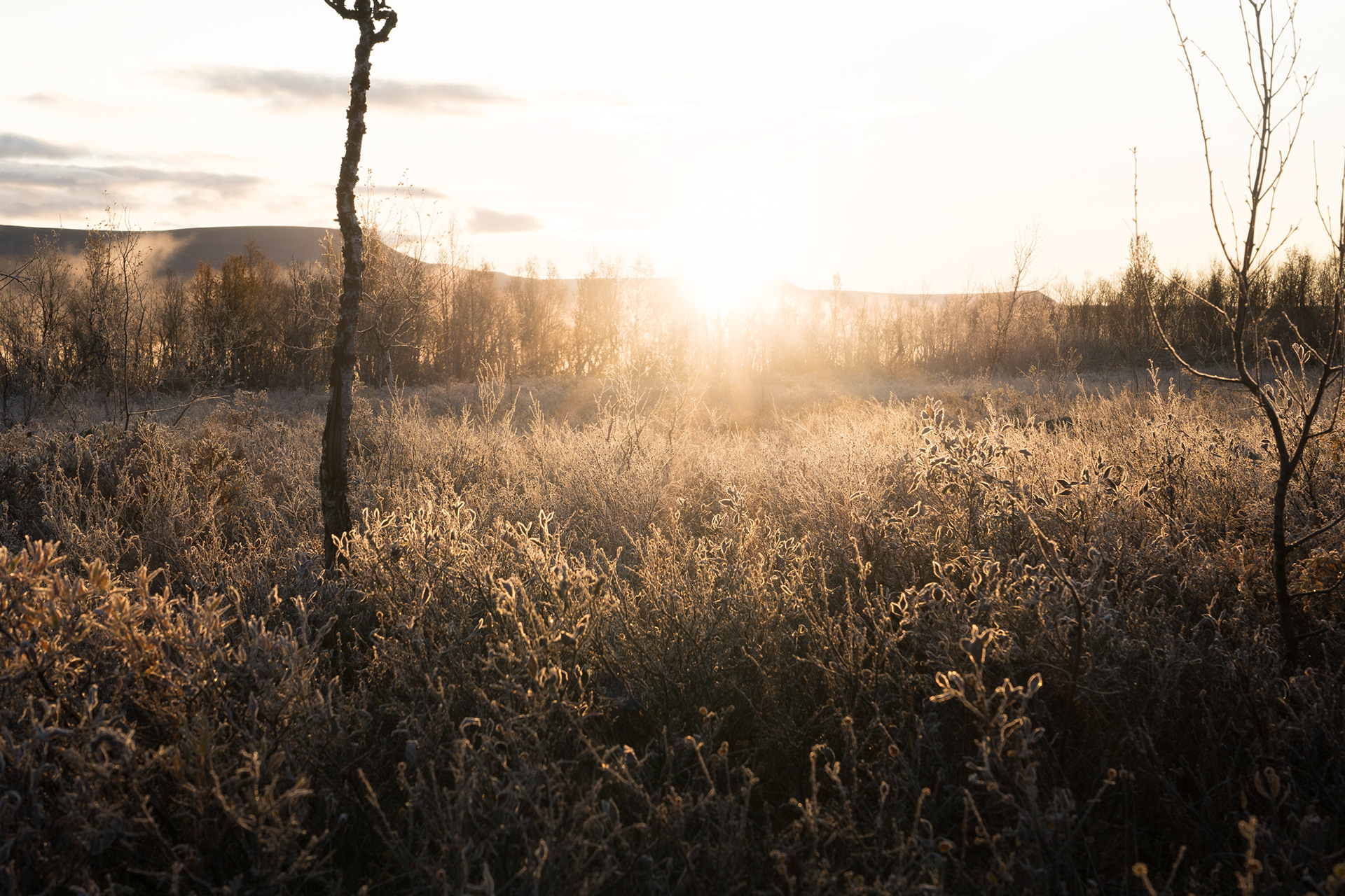 This morning was a highlight during the Kvikkjokk-Saltoluokta stage of the Swedish Kungsleden: a quiet, misty sunrise on the shores of the mirror-like Lake Sitojaure. Soft hoarfrost covered the land, and it was not until the sun had risen high enough to melt the ice and burn the mist away, did we return to the autumnal colours of the vast arctic landscape around us.