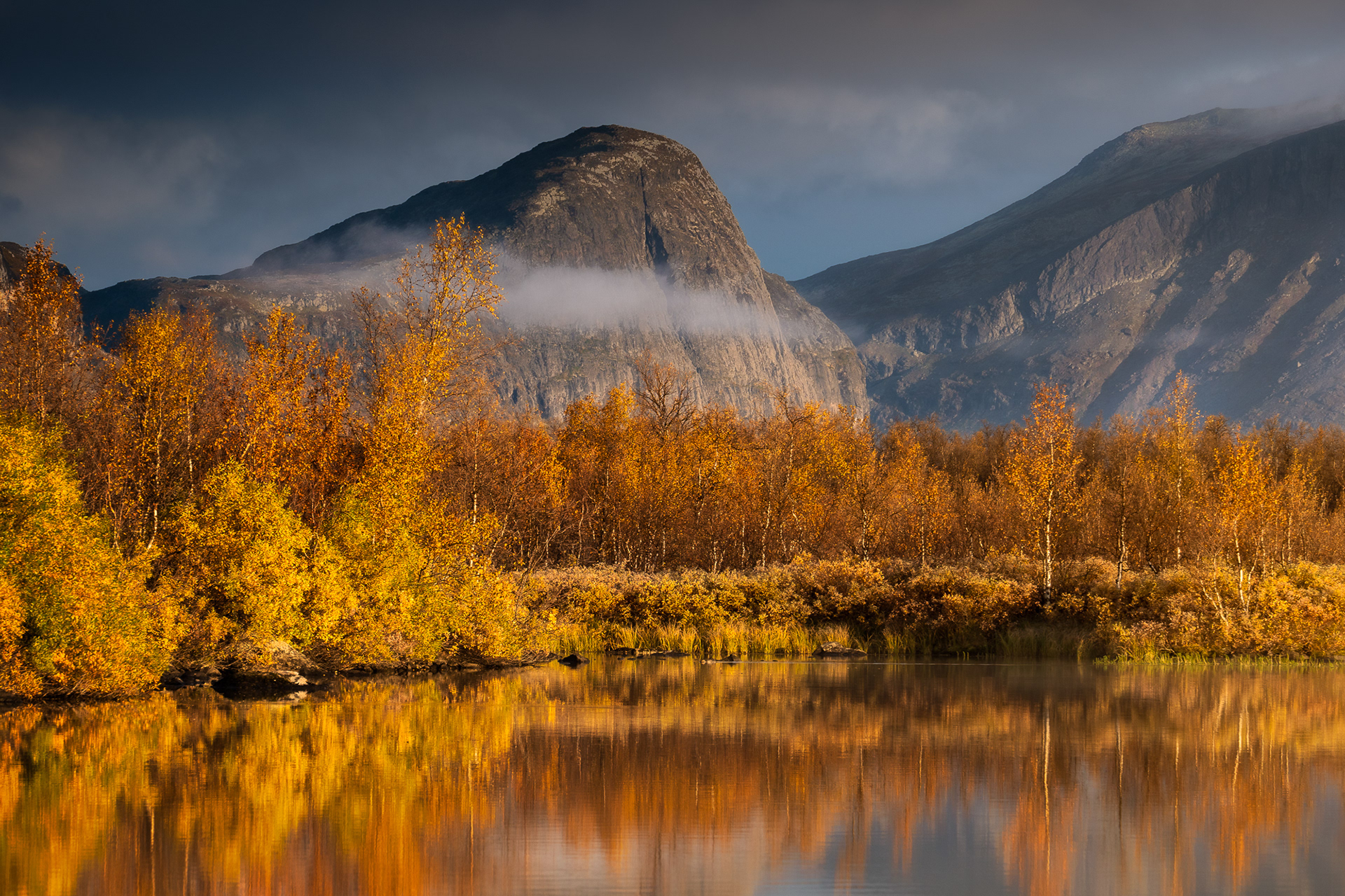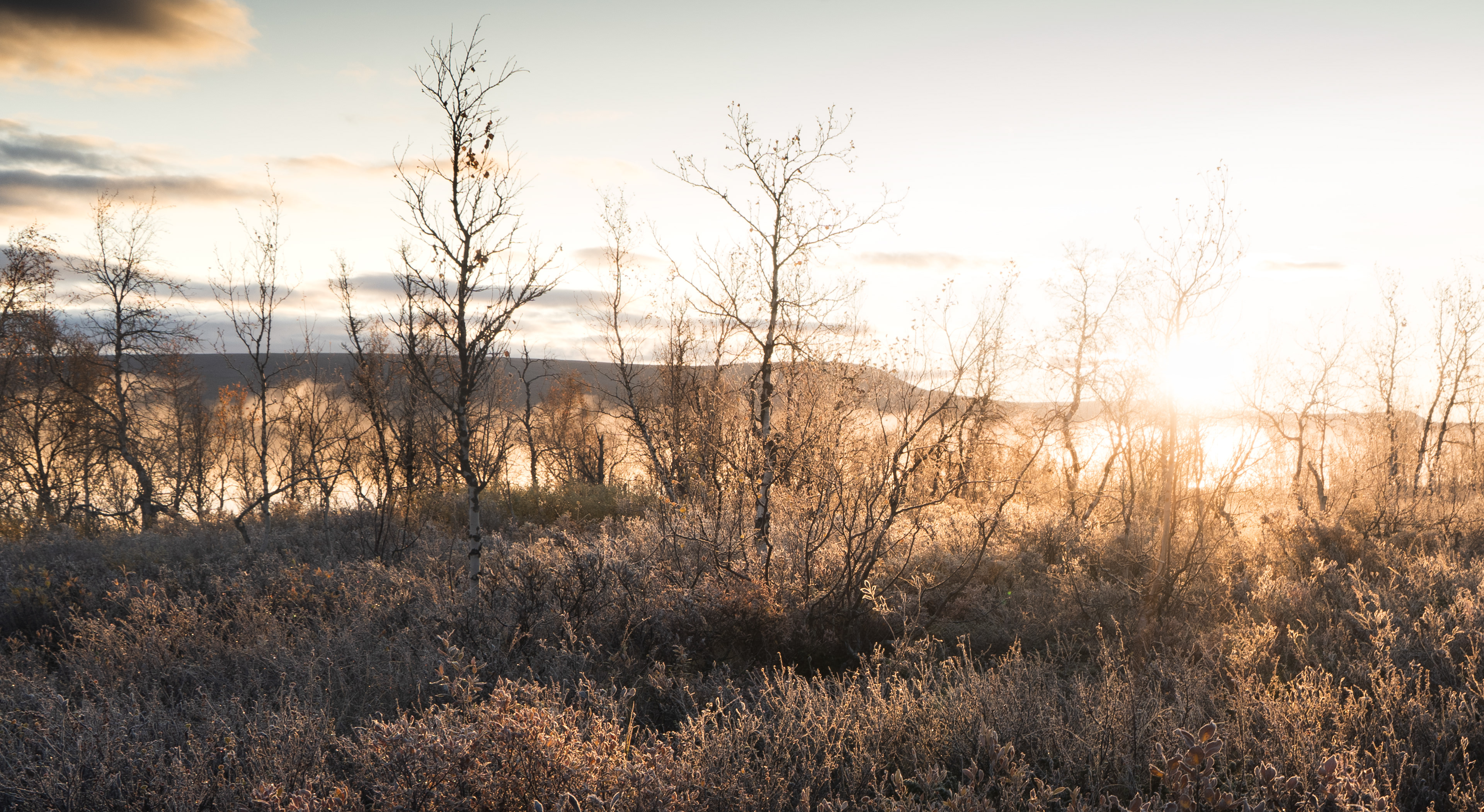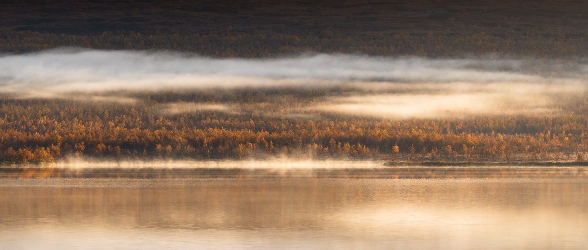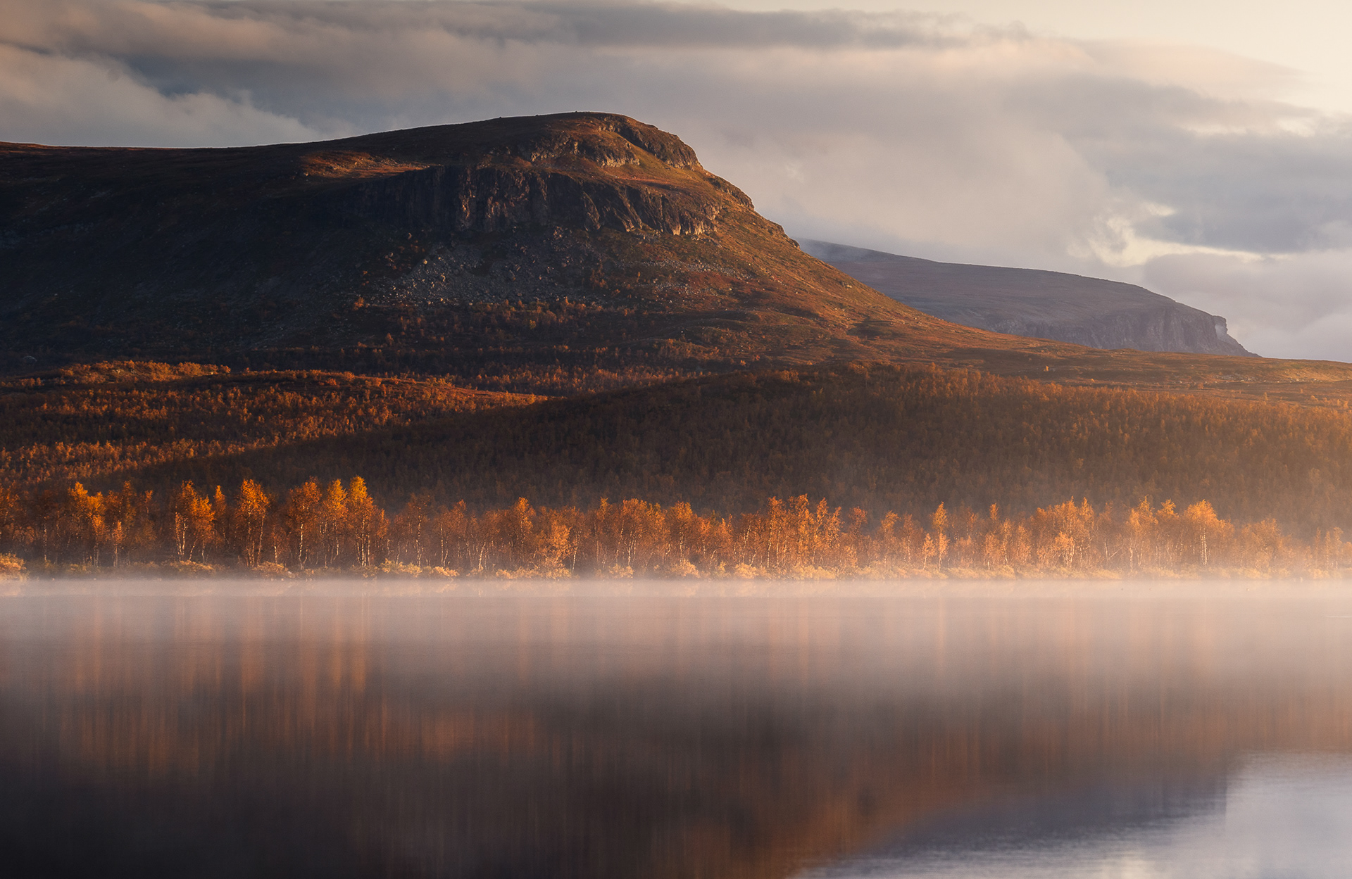 This morning was a highlight during the Kvikkjokk-Saltoluokta stage of the Swedish Kungsleden: a quiet, misty sunrise on the shores of the mirror-like Lake Sitojaure. Soft hoarfrost covered the land, and it was not until the sun had risen high enough to melt the ice and burn the mist away, did we return to the autumnal colours of the vast arctic landscape around us.