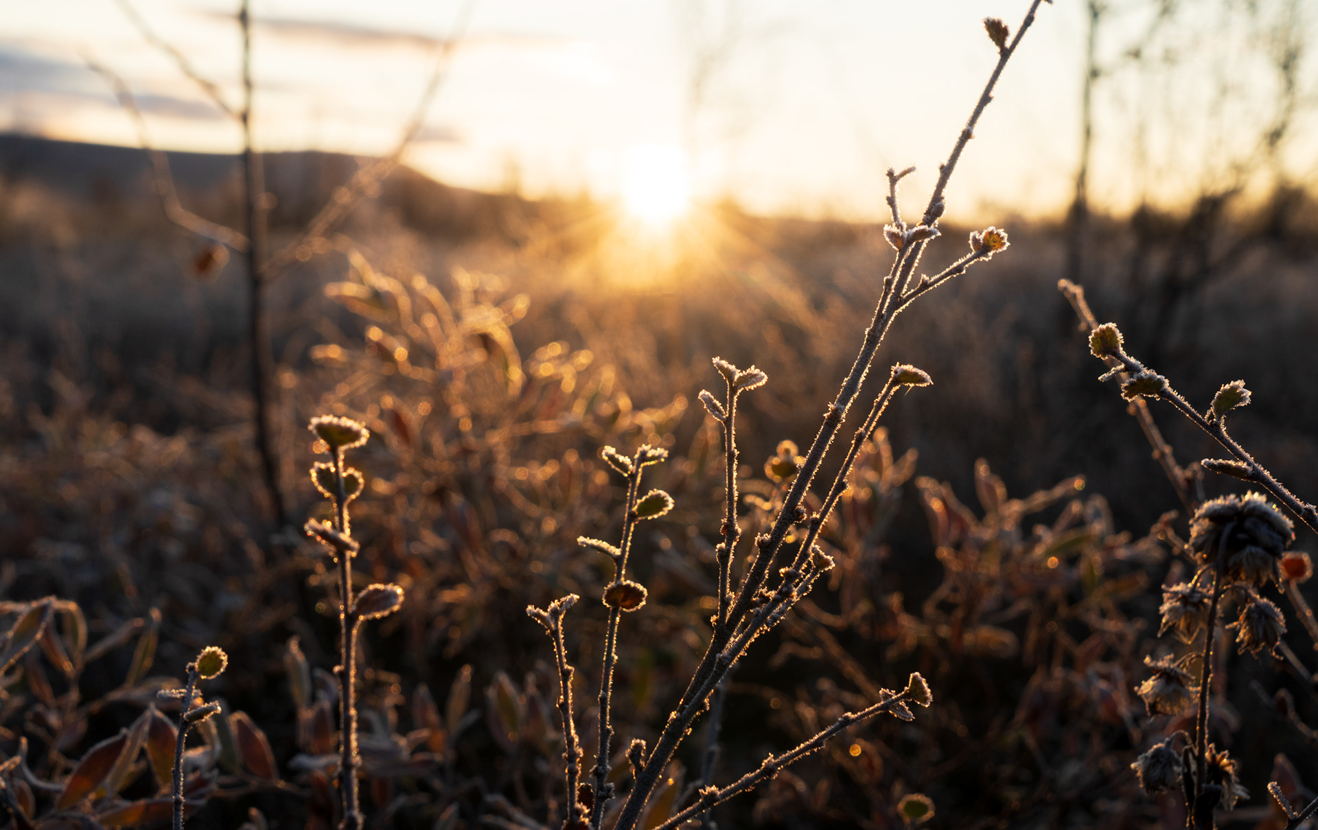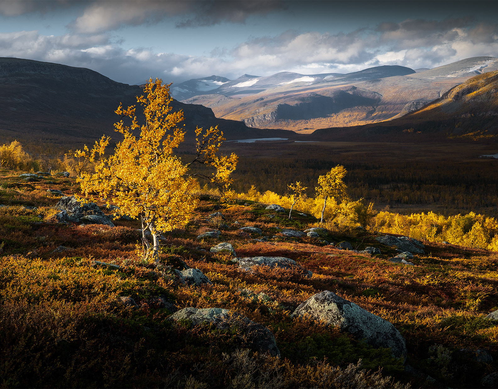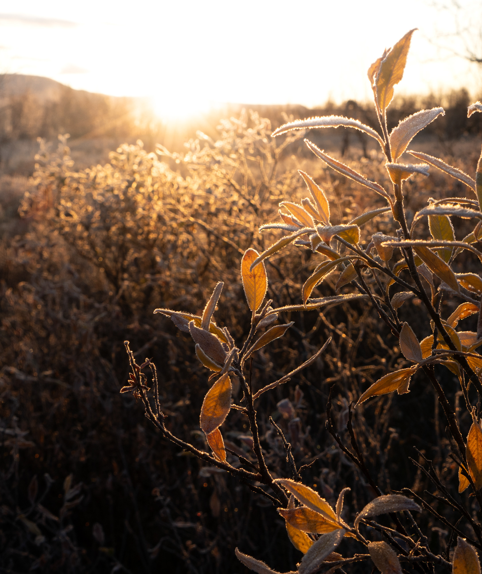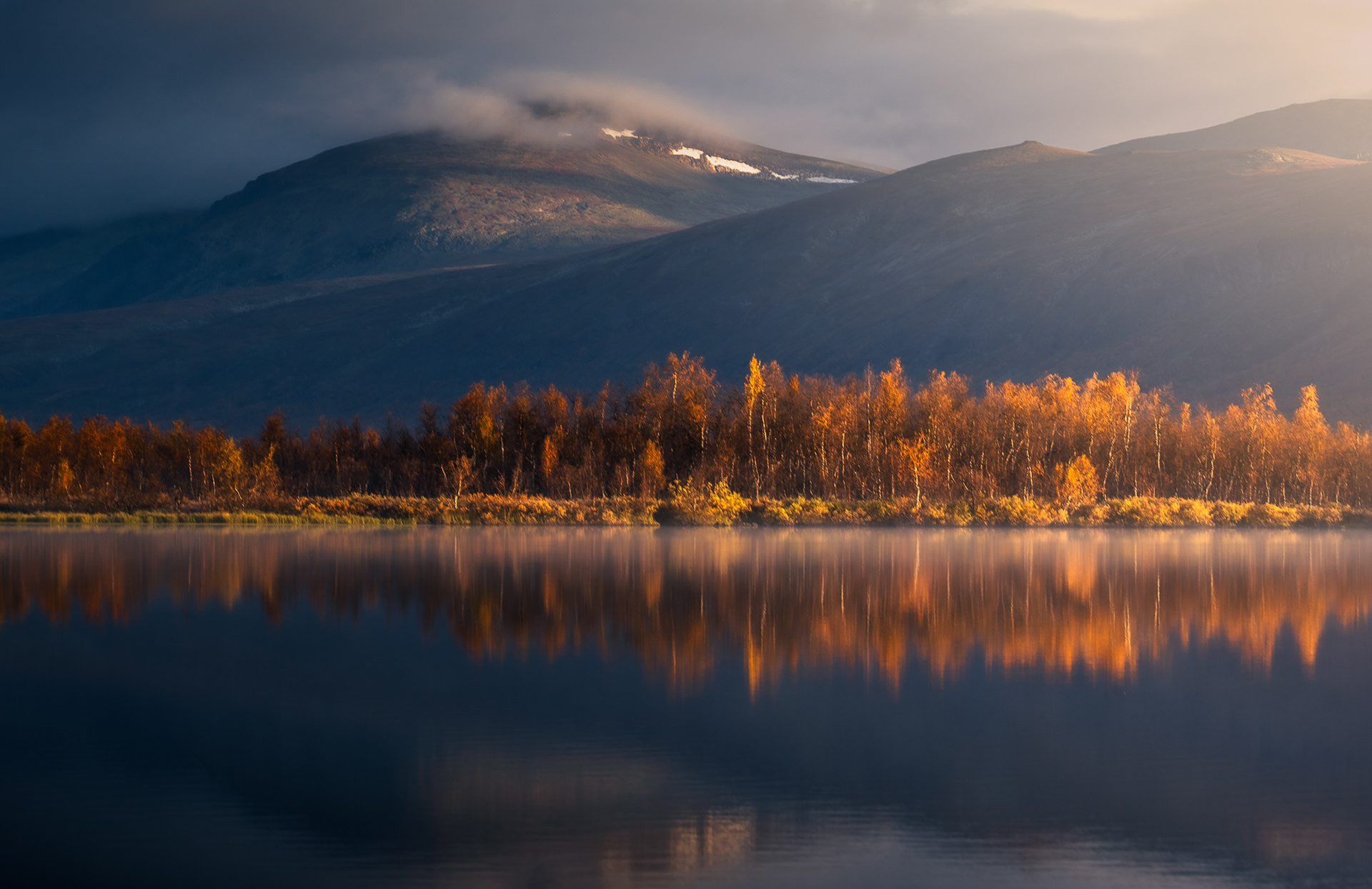 This morning was a highlight during the Kvikkjokk-Saltoluokta stage of the Swedish Kungsleden: a quiet, misty sunrise on the shores of the mirror-like Lake Sitojaure. Soft hoarfrost covered the land, and it was not until the sun had risen high enough to melt the ice and burn the mist away, did we return to the autumnal colours of the vast arctic landscape around us.